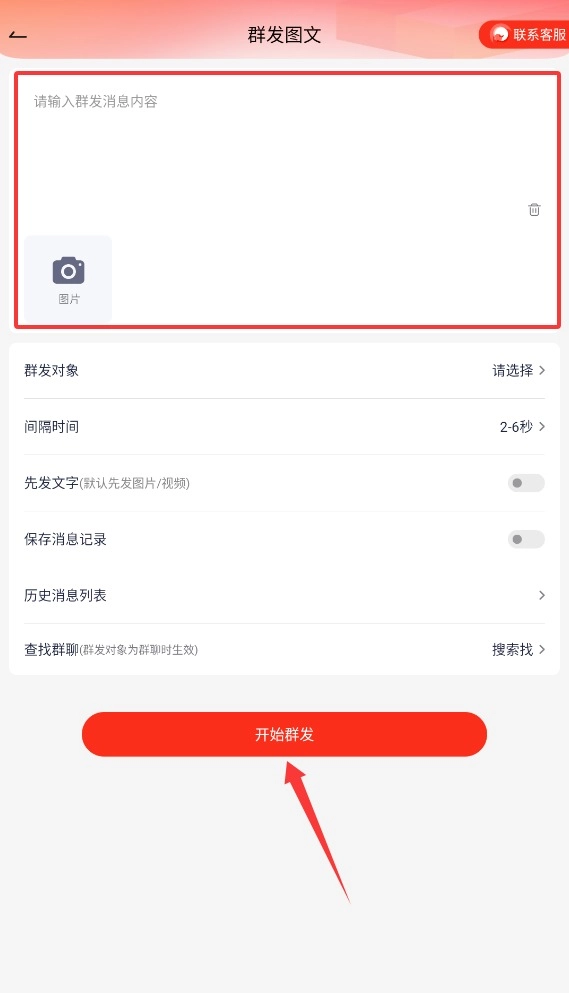 3、在编辑框输入文字内容,点击图片图标上传相关配图,确认内容无误后点击底部开始群发按钮提交发送任务。