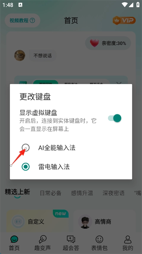 5、选择“AI全能输入法”选项、即可更改成功;