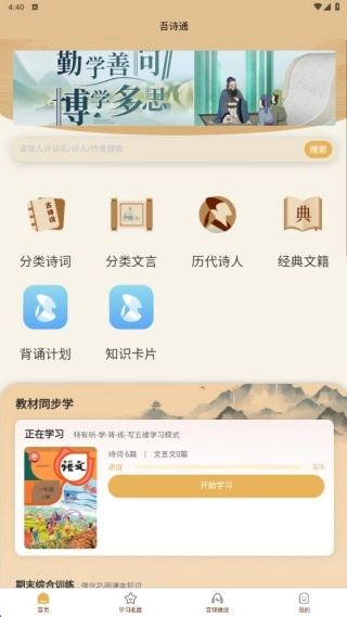 2、首页展示了分类诗词、文言等板块,还能直接在教材同步学板块浏览诗词内容。