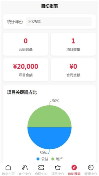 4. 点击页面下方的‘自动报表’,即可看到合同数量、项目金额、合同金额等数据报表。
