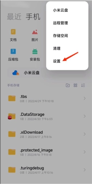 2、在文件管理中点击设置选项。