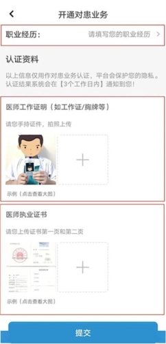 请上传“医师工作证明”与“医师执业证书”,完成后点击提交按钮,我们的工作人员会在最短时间内为您进行审核。
