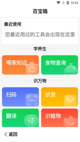 5、百宝箱的实用性较强,它涵盖了扫码、翻译、识货、听儿歌、识生字等多种功能,能为老年用户的使用提供便利。