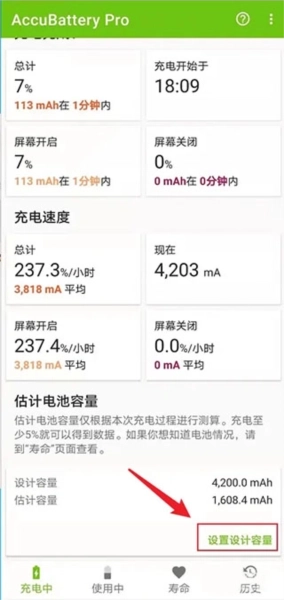 1、将手机电量用完后,连上充电器,打开软件,往下拉,找到“设置设计容量”点击进入。(最好是在手机提示还有30秒关机的时候,打开软件)