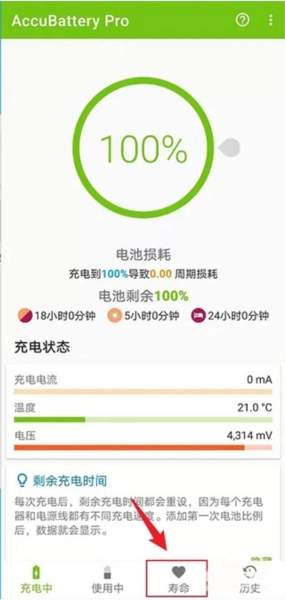 3、等待手机充电到100%后,点击底部菜单中的“寿命”。