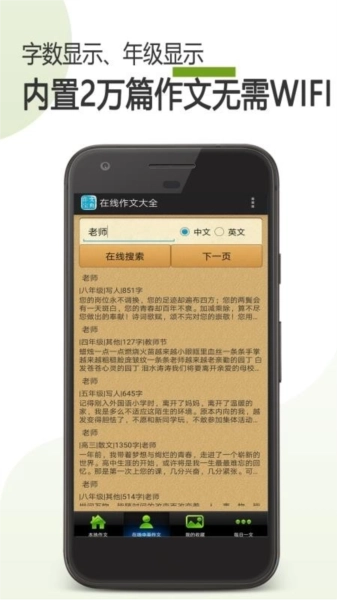 在线作文大全是湖南希仁计算机科技有限公司推出的一款作文学习软件,专为各年级学生量身打造,致力于提升学生的作文水平。这款软件了20000篇离线作文,用户即使没有网络也能随时查阅作文内容。只需输入关键词,便可轻松搜索到丰富的作文素材,包括英语作文。此外,用户还可以将喜欢的文章收藏到手机本地,随时随地进行作文学习。能够帮助用户更好获取优质作文文章作品和写作方法教学的应用程序软件,通过该在线作文大全最新版软件可以在此搜索查找到全网大量精品优质作文文章,而且这里的作文文章类型分类齐全众多,各种。议论、叙述、写人、读后感等作文文章一应俱全。