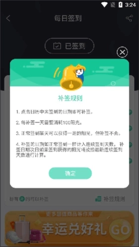 截图界面中日历内的许多补是什么意思,这些有写着补字的日期都是因为当天用户并没有进行签到,软件会给予用户补签的机会,但补签也是有条件的:每补签一天需要花费100的阳光,并且之前补签不能获取到每日的签到阳光,但会如同日常签到一样计入连续签到天数。