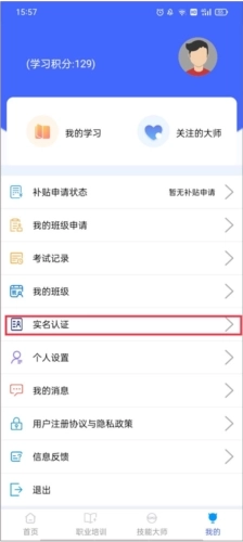 1、进入技能云南平台的个人中心后,我们找到并点击“实名认证”选项。