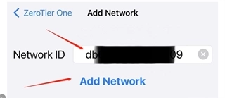 4、填写你zerotier对应的16位ID,点击addnetwork按钮就行,下方其他选项保持不变无需操作。