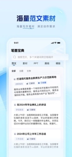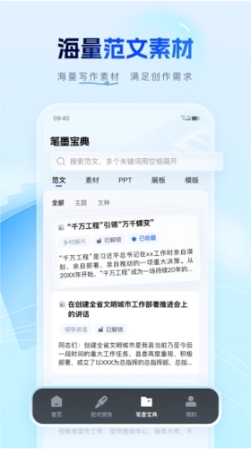 3、全面资源库:笔墨公文涵盖各类范文、写作素材、PPT模板、展板设计等资源,可满足不同领域的需求,助力激发您的无限创意,成为您源源不断的灵感来源。