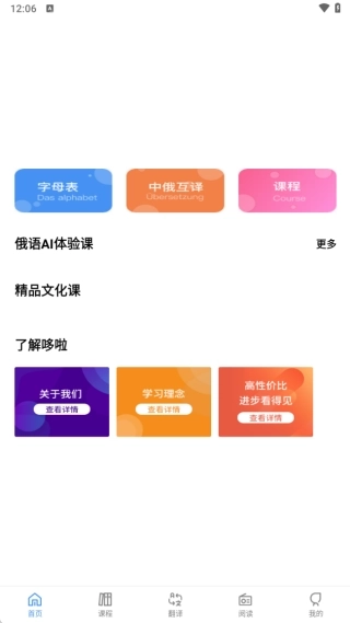 2、进入软件首页后,可看到其中包含字母表、中俄互译、课程等多个板块功能。