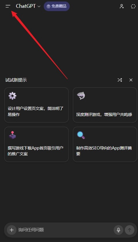 1、打开ChatGPT手机应用,点击界面左上角的菜单图标。