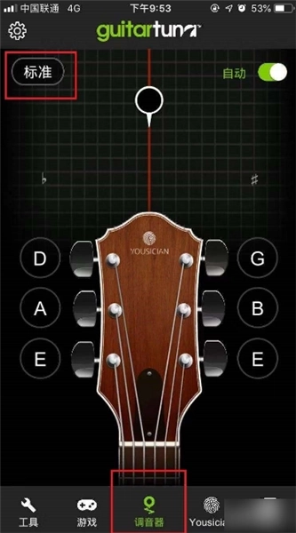 打开软件,在主界面下方有个“调音器”,软件默认是对吉他进行调弦。在界面左上角有个“标准”,里面可以设置其他乐器的调弦,如尤克里里和贝斯。