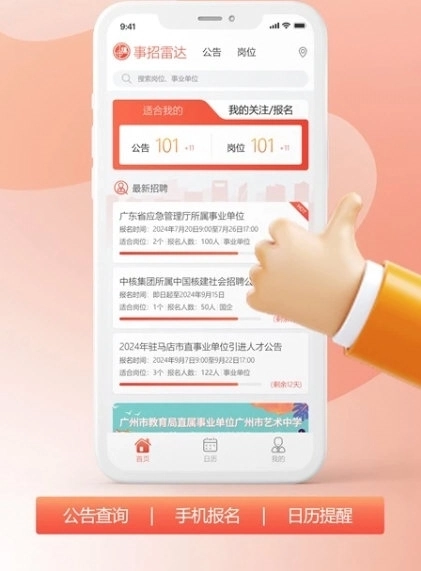 事招雷达是广州网才信息技术有限公司为广大用户打造的实用考编服务平台,汇集了全国各地区事业单位的招聘信息,用户可根据自身需求浏览查看,助力更高效地备考。平台支持在线考试报名,还有各类相关资讯可供查阅,能帮助解决用户遇到的各类问题。此外,软件配备了多项优质功能,方便用户快速找到所需招考信息,有效节省时间和精力。若你也想体验,不妨即刻尝试!