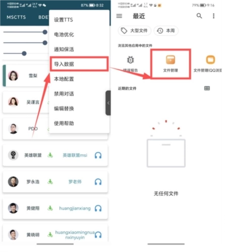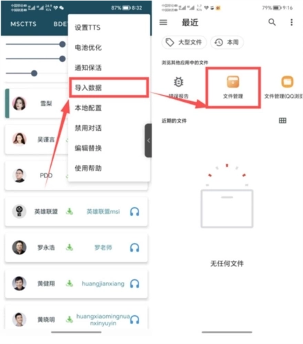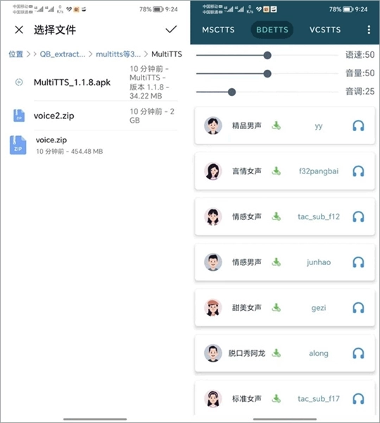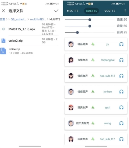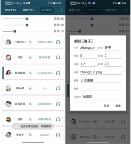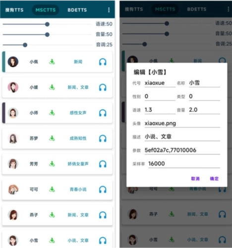 1、点击软件右上角的按钮选择导入语音包,等待一会就有数据了;导入成功之后,就能试听并编辑这些声音了,可以长按它们的头像,单独设置它们的语速音量等参数;