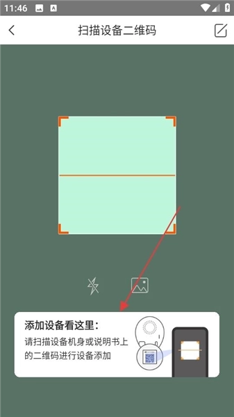 2、进入扫描设备二维码页面,依据提示,扫描设备机身或说明书上的二维码,按指引完成设备信息录入与配对。