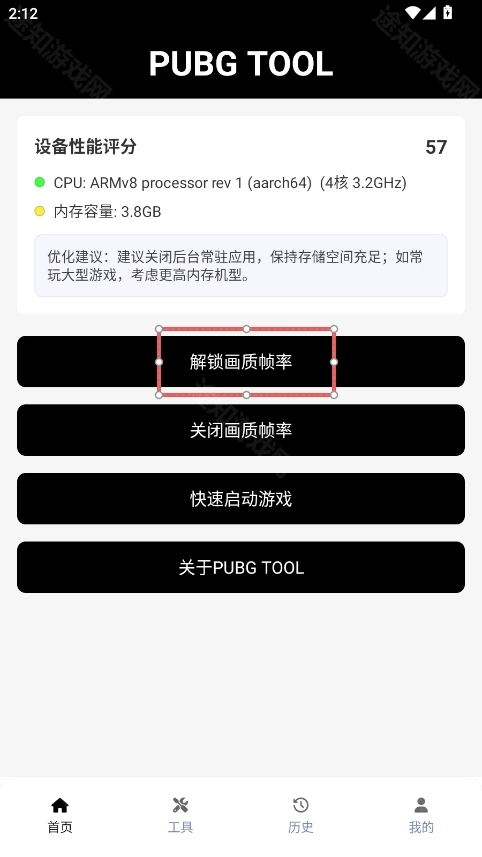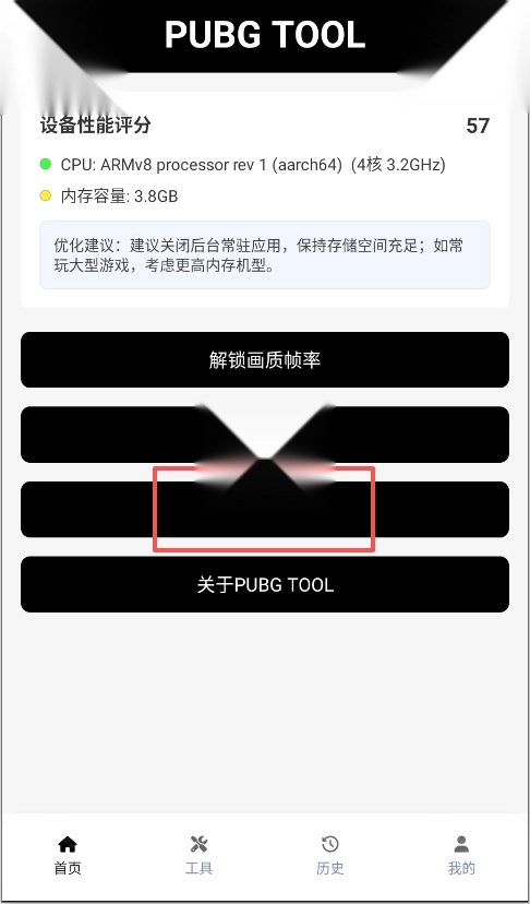 1、打开pubgtoll画质助手,如果没有进行过任何设置,则点击【解锁画质帧率】,