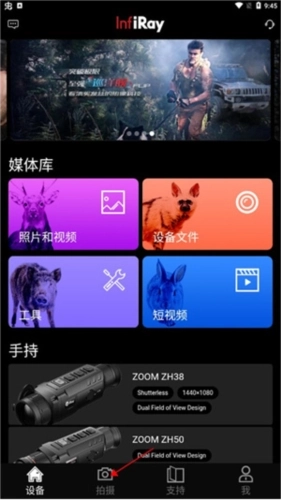 1、首先打开InfiRayOutdoor应用,点击拍摄功能。该软件主要借助无线网络连接,实现对红外设备的成像查看、录像录制以及远程访问操作。