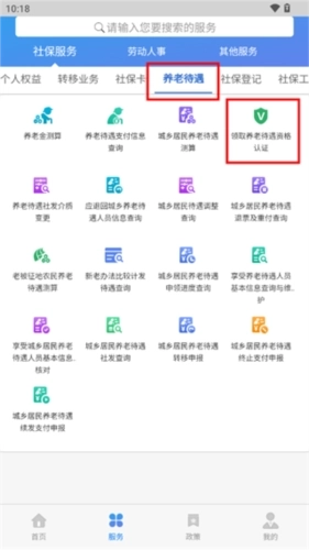 2、点击“更多服务”,找到“养老待遇-领取养老待遇资格认证”选项。