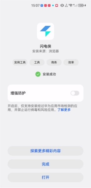 5、最后,当界面上出现绿色对号时,就表示“安装完成”了,此时点击“打开”按钮,就能开始体验了。