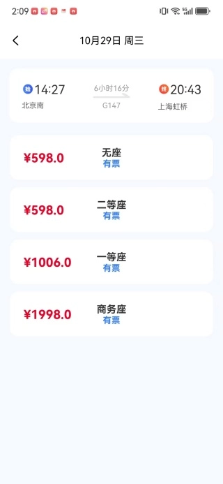 3、系统会实时展示可供选择的车次清单,其中涵盖了发车时刻、票价信息以及余票情况。