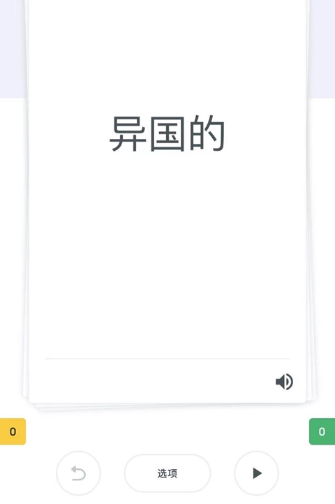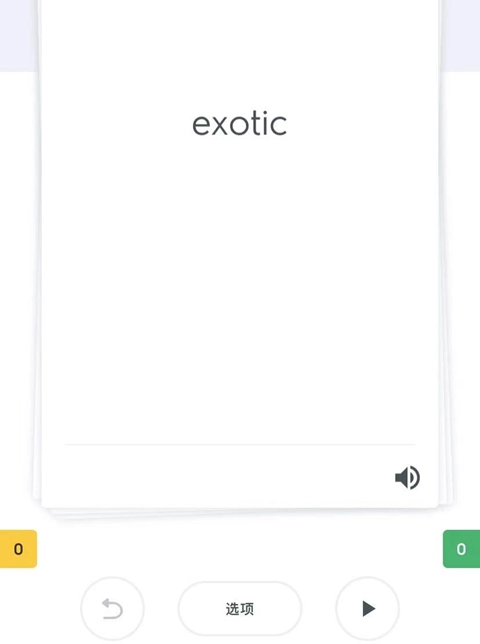 学习步骤:点击上图中“单词卡”模式通过“正反面卡片”方式对单词进行首次记忆。点击“单词卡”后将出现如下页面(系统默认先显示卡面正面,卡片正面默认对应中文词义),需点击下图底部的”选项“按钮进行重新设置。