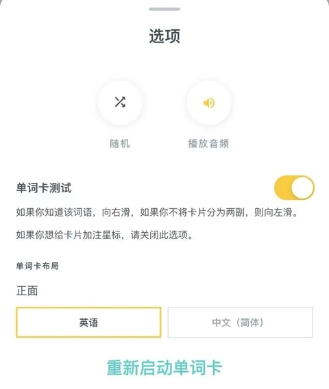 设置完成后,点击底部的“重启启动单词卡”按钮,系统就会按照先展示正面的“英文”内容、再呈现背面的“中文”释义这样的顺序,依次推进单词学习流程。