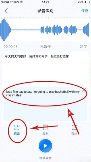 4、转写完成后,我们既可以点击下方的翻译按钮,也能把中文翻译成英文