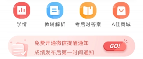 打开A佳查分手机版后,在首页中间位置能看到【免费开通微信提醒通知(成绩发布后第一时间通知)】的提示。这意味着我们只需绑定个人微信账号,成绩公布时就能立刻收到通知,无需专门去查询成绩。