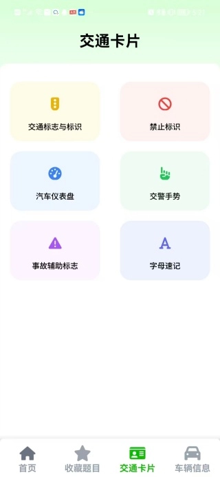 4、在交通卡片页面提供交通标志与标识、禁止标识、汽车仪表盘、交警手势、事故辅助标志和字母速记功能。