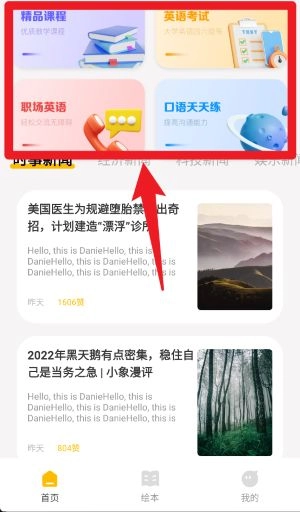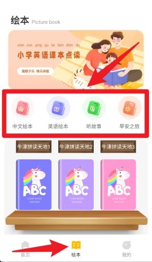 3、点击底部的绘本按钮,进入页面后选择中文绘本、英文绘本、听故事等分类,就能查看绘本资源了。