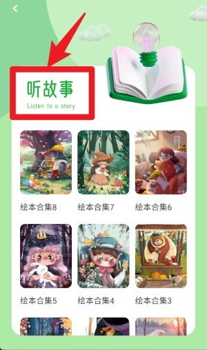 4、在听故事页面点击任意一本绘本合集封面,即可开始播放该绘本的音频内容,进行听力学习。