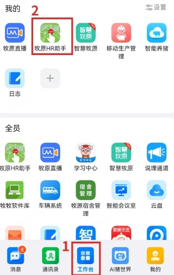 ①打开智慧牧原pro的“工作台”,然后点击“牧原hr助手”