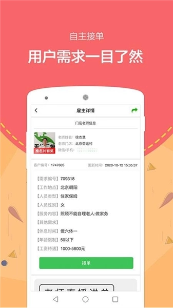 5、雇主详情,为服务员用户详细的介绍了雇主需要的人选,可根据自身情况进行接单;