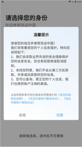 3、在获得同意后,用户可自主选择成为货主或司机,一旦选定则无法更改。
