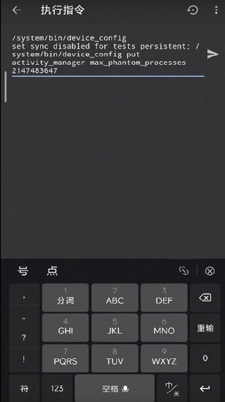 5. 输入如下这串指令:/system/bin/device_config set_sync_disabled_for_tests persistent; /system/bin/device_config put activity_manager max_phantom_processes 2147483647。