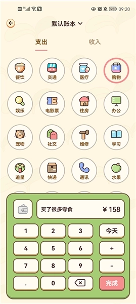 3、比如今天去超市购买了很多东西,那你就可以点击购物,备注一下金额用途,在输入金额和时间即可;