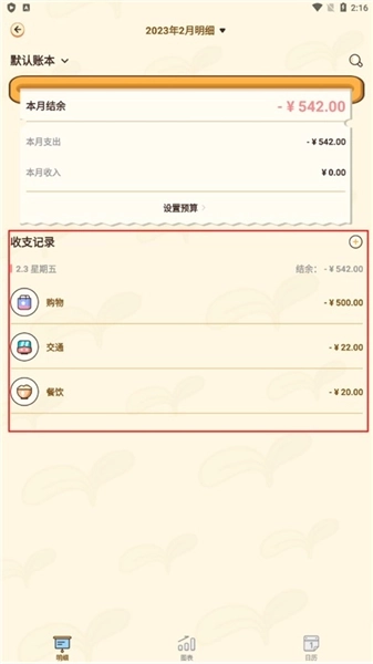 3、日历视图,每月收支一目了然。