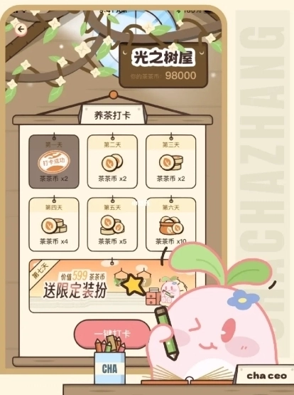 2、同时每日打卡也可以获得茶茶币,坚持7天还有丰厚的奖励哦。