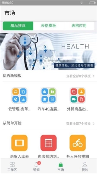 伙伴云表格是一款由伙伴智慧(北京)信息技术有限公司开发的效率办公手机软件,该软件可以让各位用户们轻松做出各种各样常用的表格。就算是小白有了该软件也可以非常简单容易上手,可以随时随地轻松做表格,提供工作团队效率,让工作更加轻松简单。在这里,你可以轻松制作各类常用表格,随时随地共享工作进度,让团队协作变的更加高效。可以让团队中的成员快速的共享自己的工作进度,使团队协作变得更加的高效;应用拥有众多的表格模板,多种多样的类型提供给用户,用户可自由的进行查看,迅速的选择出喜欢的模板,轻松就能完成表格的制作,十分的方便快捷;在这里,为用户整合了消息模块,让用户能够便捷的查看到各种通知消息,轻轻一点就能了解到消息详情,非常实用。