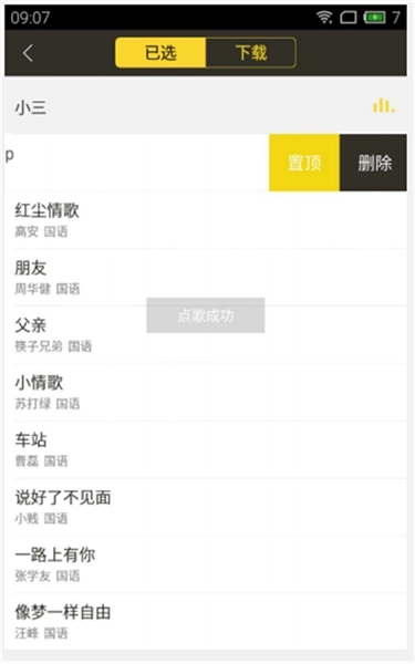 点击右上方音符,进入已选和列表,这里显示所绑定点歌机已选和正在的歌曲。在这个界面中,除去第一首歌曲,均可向左滑动弹出更多菜单,进行歌曲删除和置顶操作。