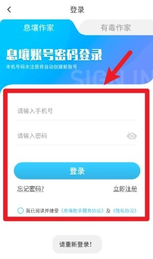 1、打开息壤助手,在登录界面输入手机号与密码,随后点击“登录”按钮,就能迅速进入息壤助手平台的使用界面。