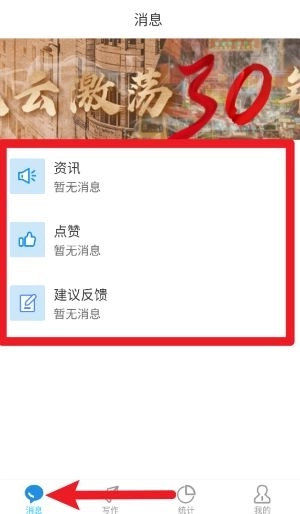 2、点击底部导航栏的“消息”按钮,即可查看收到的资讯通知、点赞信息和建议反馈内容。