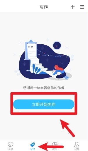 3、点击下方的“写作”选项,接着点击“立即开始创作”按钮,就能进入创作界面,着手撰写文章或其他内容了。