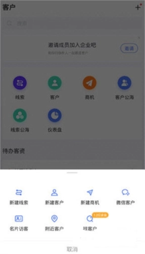 1、进入客户页面后,点击右上角的“+”按钮,接着选择【找客户】选项。