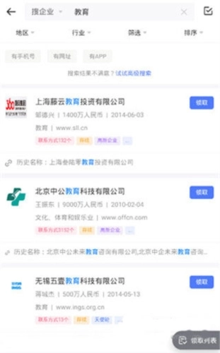 1、支持自主开发客户资源,只需在搜索框中输入企业名称、法人信息、经营范围或所属行业,就能借助大数据系统实现自主获取客户的功能。