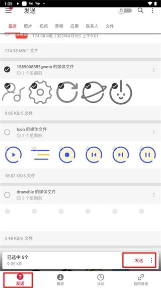 1、在“发送”页面选定待传输的文件后,点击“发送”按钮。