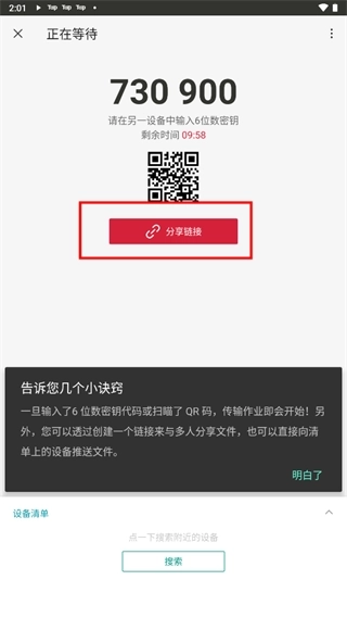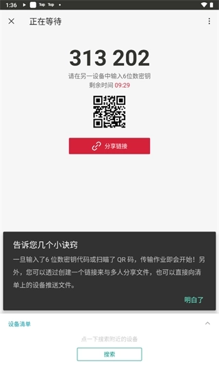 在接收设备上输入该密钥后即可立即传输文件。支持照片、视频、音乐、文档和APK文件等多种格式,也能通过扫描二维码完成传输。6位密钥的有效时长为10分钟。