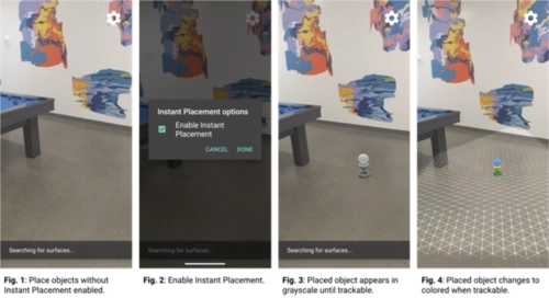 借助InstantPlacementAPI,用户无需等待ARCore完成表面几何图形的检测,就能直接把AR对象放置在屏幕上。当用户在环境里持续移动时,系统会对AR对象的放置位置进行实时优化。一旦ARCore在AR对象所处区域检测到准确的姿态,原本显示的白色对象就会自动更新为姿态精准的状态,同时从半透明转为不透明。