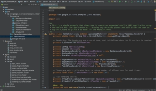 借助hello_ar_java应用,您能够在检测到的AR平面上放置一个三维ARCore典当。该应用通过AndroidGLSurfaceView来实现功能,AndroidGLSurfaceView可用于渲染相机预览以及平面、锚点等基础AR对象。hello_ar_java的示例渲染框架可在com/google/ar/core/examples/java/common/samplerender路径下找到。